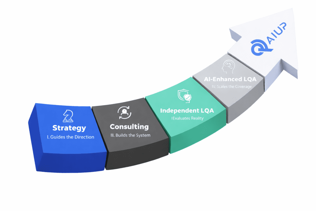 QAiUp operates under ISO 9001–certified quality management framework, enabling disciplined LQA execution and effective QA system design—and supporting clients through LQA strategy and consulting for long-term quality growth.